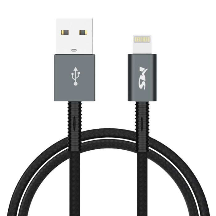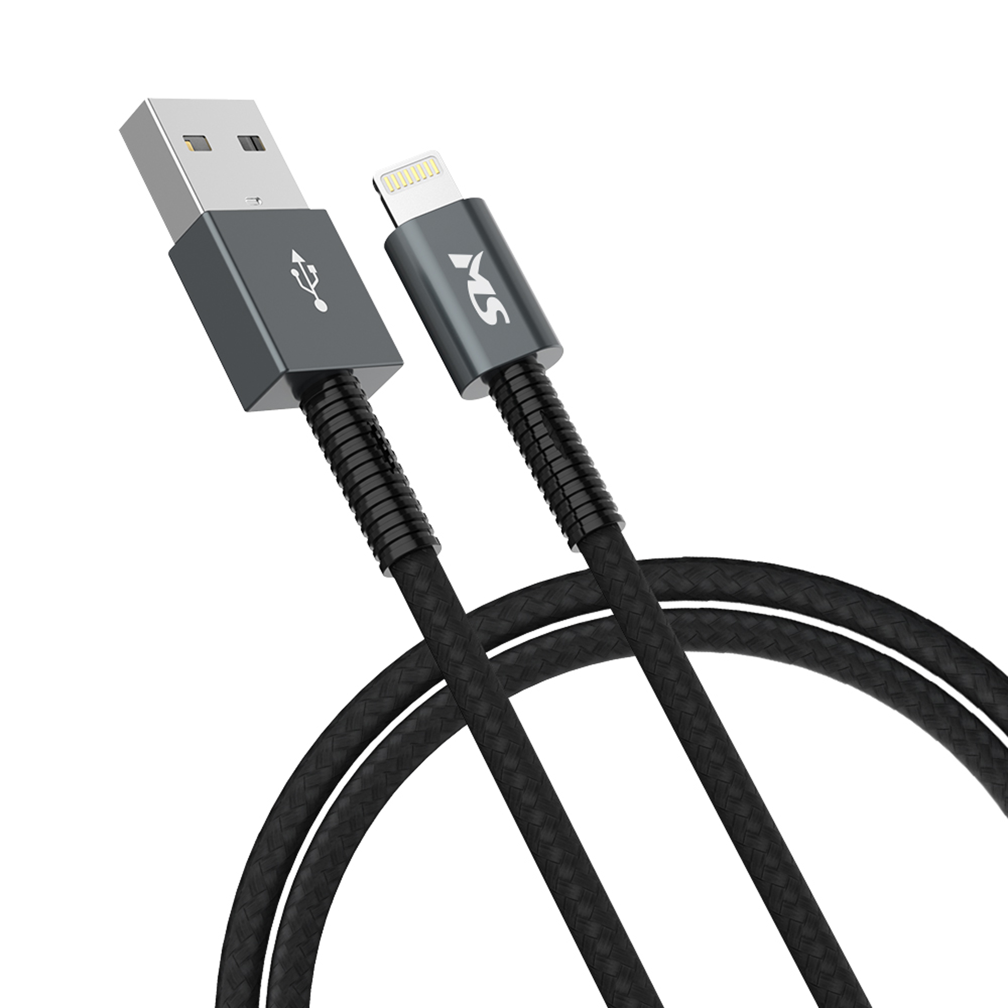 MS CABLE USB-A 2.0 ->LIGHTNING, black, Material: nylon braid + aluminum alloy shell, Length: 1.0 m, Current 2.4A. The cable supports screen mirroring of mobile phones in the car. M-AL3100B.