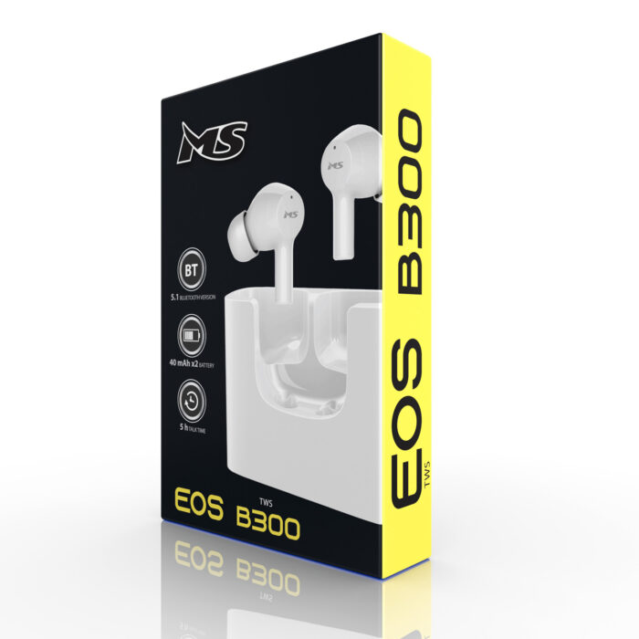 MS EOS B300 wireless TWS headphones, Bluetooth; Headphone charging time: 1.5 hours; Case charging time: 2 hours; Speaker impedance: 45Ω ± 15%; speaker sensitivity: 90 ± 3dB; MIC sensitivity: -42 ± 3dB, color white.