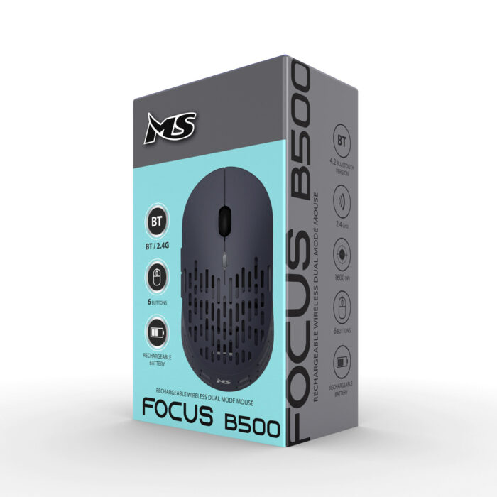MS FOCUS B500 gray bluetooth – wireless mouse, rechargeable mouse – dual solution Bluetooth 5.0 + 2.4G resolution 1600 DPI, with 2 programmable buttons, USB port