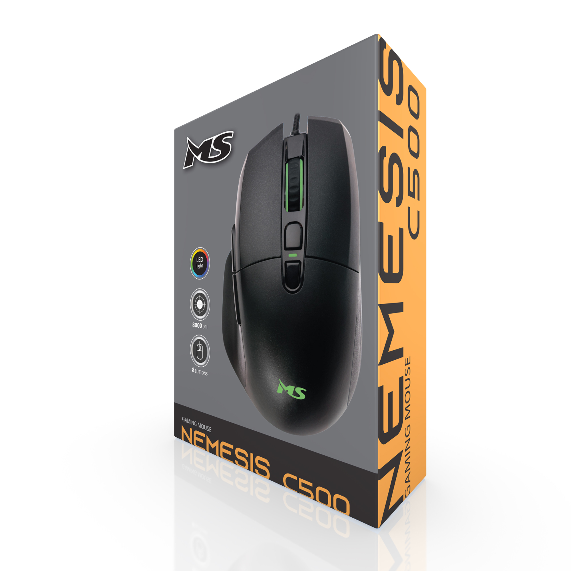 MS NEMESIS C500 wired optical gaming mouse with LED lighting, resolution 800-1400-2600-3400-4500-6000-8000 (default 1400DPI), PIXA RT3325, with USB connector and braided cable length 1.5m, black color.