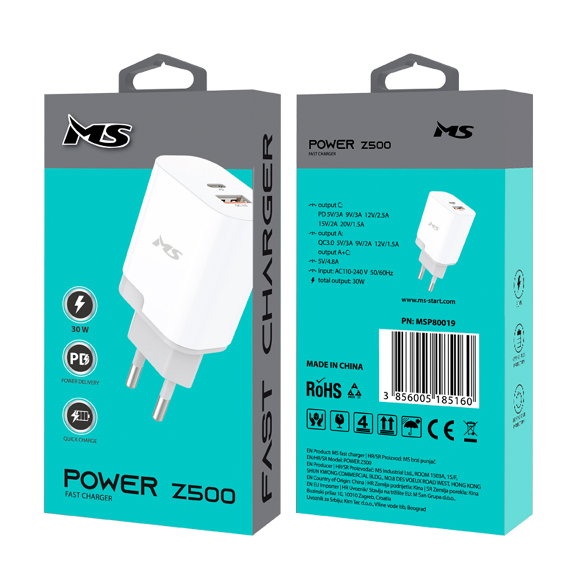 MS POWER Z500 fast charger, Compatible with all devices that support Type-C+USB fast charging function, INPUT: AC110-240V 50/60Hz, OUTPUT C: PD3.0 5V/3A 9V/3A 12V/2.5A 15V/2A 20V /1.5A, OUTPUT A: QC3.0 5V/3A 9V/2A 12V/1.5A, OUTPUT A+C: 5V/4.8A, TOTAL POWER: 30W, color: white.
