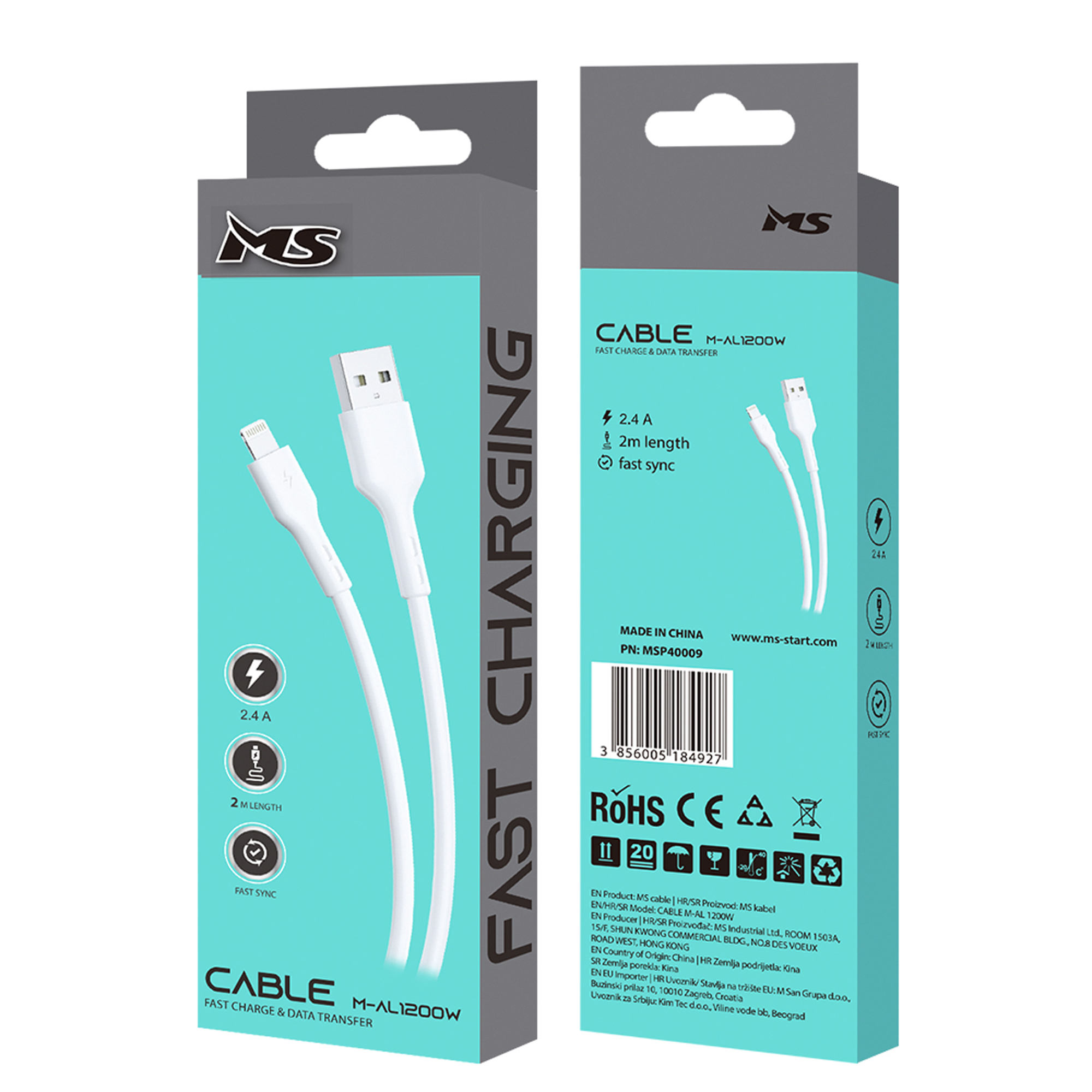 MS CABLE 2.4A fast charging USB-A 2.0-> LIGHTNING, USB DATA KABEL Materijal: TPE Duljina: 2m Izlaz: 5V 2.4A Boja: bijela. Kabel podržava screen mirroring mobitela u automobilu. M-AL1200W