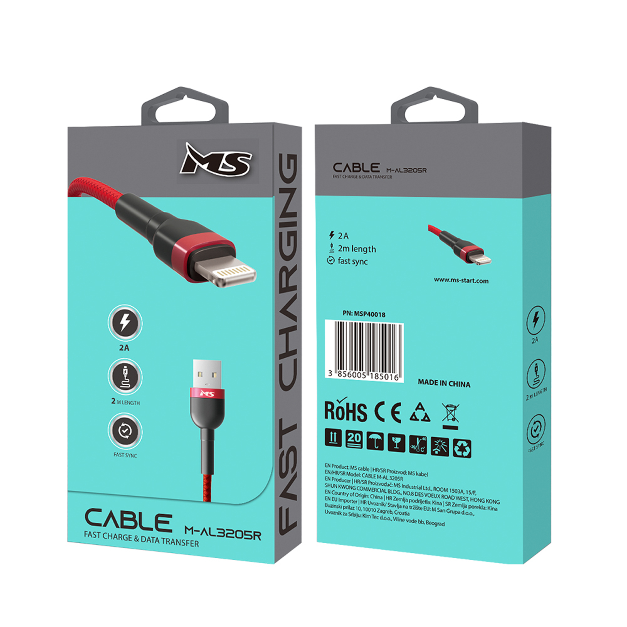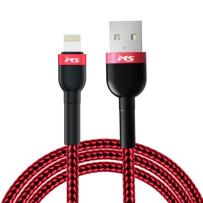 MS CABLE USB-A 2.0->LIGHTNING, Materijal: najlonska pletenica + školjka od legure aluminija Duljina: 2,0 m Struja 2.4A, crveni. Kabel podržava screen mirroring mobitela u automobilu. M-AL3205R.