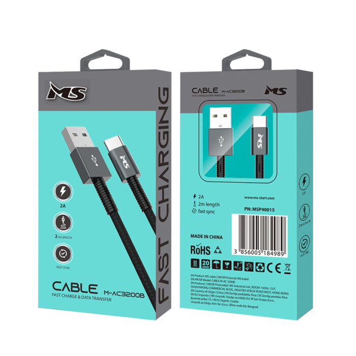 MS CABLE USB-A 2.0 -> USB-C, Materijal: najlonska pletenica + školjka od legure aluminija Duljina: 2,0 m, Struja 2.4A, crni. Kabel podržava screen mirroring mobitela u automobilu. M-AC3200B.